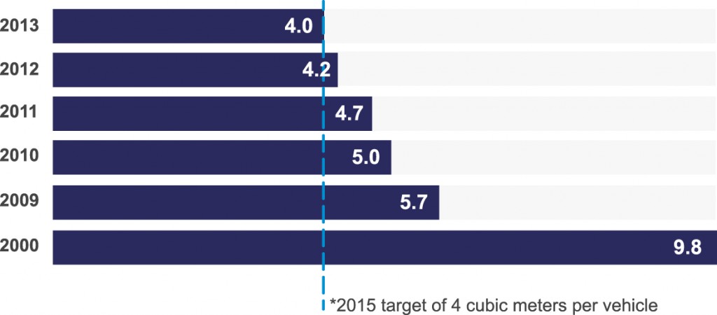 Not only has the company reached its water-use-per-vehicle goal two years ahead of schedule, it cut global water use by 61%, or by more than 10 billion gallons, between 2000 and 2013. That savings is the equivalent of 1 billion five-minute-long showers. The total amount of water used around the globe at Ford facilities went from 64 million cubic meters per year to 25 million cubic meters.